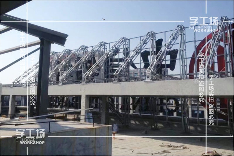 钢架材料进行防腐、下料、成组焊接和支撑横担。要特别注意的是,楼体发光字特性受海风的影响很大,海风的湿度和含盐量对钢结构有很强的腐蚀性,必须严格做好防腐工作。用于除锈的磨料必须符合质量标准和工艺要求。除锈后,可用刷子和其他工具清洁钢材表面,然后才能进行下一道工序。例如,除锈后的钢材表面是合格的,在涂底漆之前已经返锈。